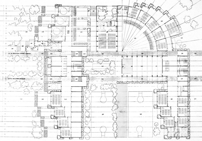 Se ha procurado que el programa actual no condicione de una forma rígida el futuro funcionamiento del edificio, de forma que puedan introducirse modificaciones de programa si fuera preciso. La disposición de los pasillos, escalonados en plantas, procura suprimir la monotonía habitual en ellas y, al mismo tiempo, resuelve el problema de una manera más racional pues, a medida que disminuye el tránsito por los mismos, se van estrechando, dando lugar a una disposición en dientes de sierra a las correspondientes clases.