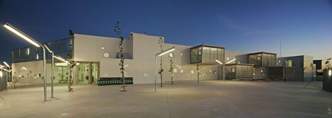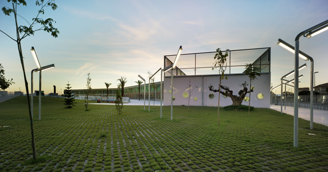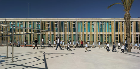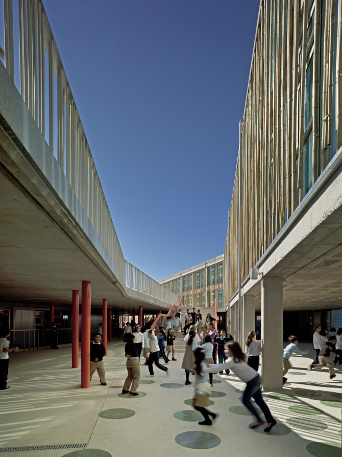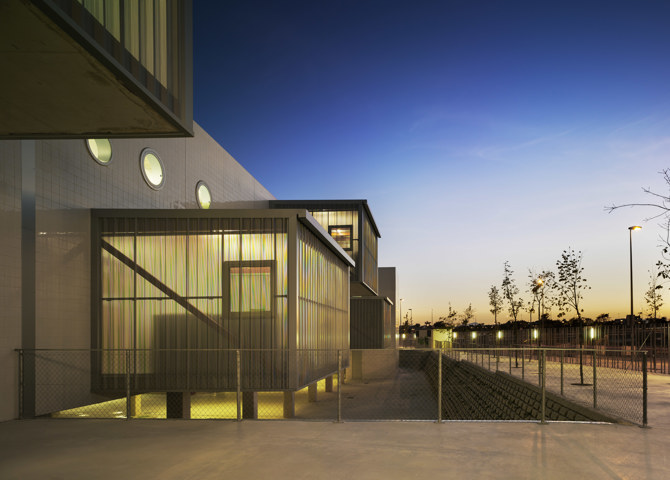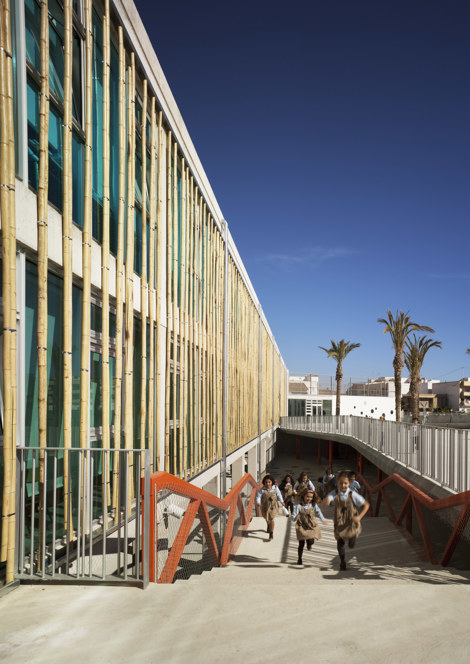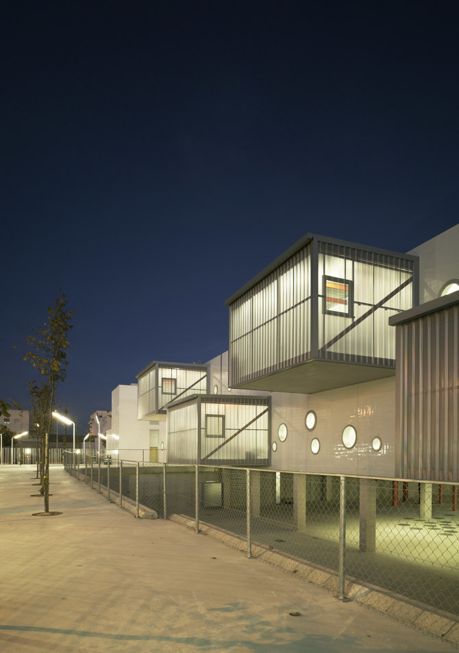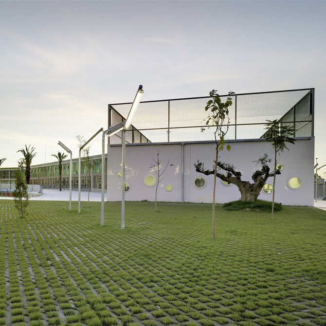 El terreno sobre el que se dispone el colegio se sitúa en un área nueva de crecimiento estratégico de la ciudad en cuyo entorno próximo se concentran equipamientos educativos y culturales de uso público: biblioteca, instituto, polideportivo. El colegio es un paréntesis en la ciudad, un paréntesis de servicios, educación y ocio en el que los niños encuentran su cita diaria de una forma atractiva, segura y sobre todo diferente; se concibe como una caja de sorpresas, donde se acumule fantasía e imaginación, conocimientos, sueños, color, donde todo tiene múltiples posibilidades y usos: caminamos por una cubierta o por una pared, vamos al invernadero, al jardín aromático, quizás hoy la clase de gimnasia sea en la pista deportiva, o jugamos al baloncesto en las alturas.