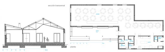El “comedor tipo” parte de la forma y estructura de una “nave industrial”. Esto nos permite cubrir un espacio de grandes luces con un bajo coste, además de una rápida ejecución ya que gran parte de la estructura puede ser montada en taller y posteriormente ensamblada in situ. El acabado exterior de cubierta y cerramientos a base de paneles de chapa de acero lacada en blanco redunda en la rapidez de ejecución.