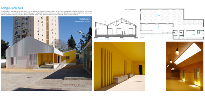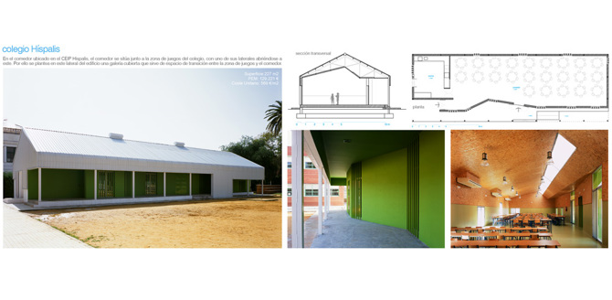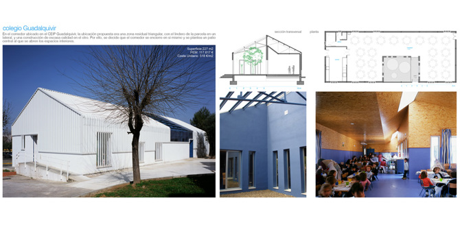 4 comedores para colegios en 4 localizaciones en Sevilla La propuesta para la construcción de varios comedores en diferentes colegios de Sevilla se enmarca dentro del Plan Apertura de la Junta de Andalucía, con el que se pretende que la escuela pública empiece a ofertar servicios complementarios a la docencia (comedores, aula matinal, talleres extra escolares, etc.).