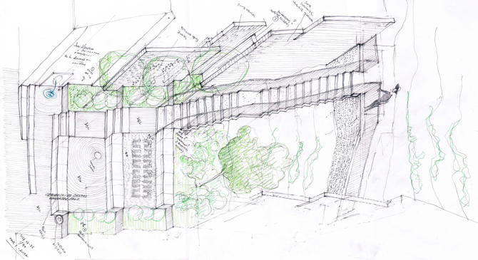 El desnivel se hace escalón, banco, plataforma, que acoge el sentir de los blancos aromas de la vegetación y, finalmente escalera, alfombra flotante que eleva hacia un mirador desde el que contemplar el valle del Guadalhorce.