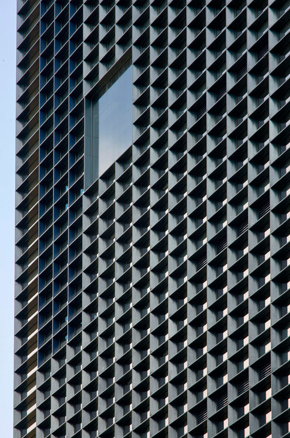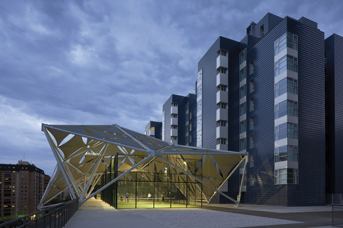 Fue el aparcamiento quien estableció la trama estructural común a todos los edificios, trama configurada según un módulo de 8,40 x 8,40 m que se utiliza y extiende en todo el complejo. Pero si bien el aparcamiento y los servicios son los auténticos cimientos de Aragonia, ello no se hace sentir en la imagen del mismo, que se presenta como diversa y libre, facilitando el paso inferior de los peatones bajo los volúmenes construidos, lo que da lugar a la conexión y traba de los dos frondosos parques entre los que se inscribe el complejo.