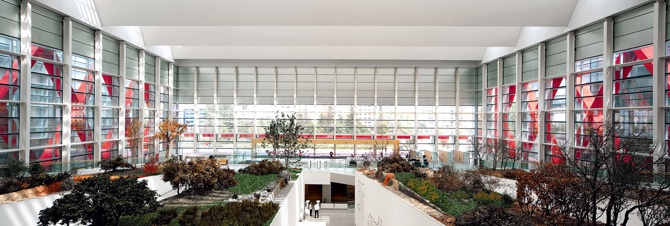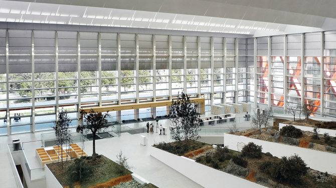 Por otro lado, mientras que el museo se caracteriza al exterior por la celosía romboidal de color rojo de sus fachadas laterales, el Centro Nacional de Investigación, situado al este, se reviste en dos frentes con paneles verdes con rombos recortados, y el palacio de Exposiciones y Congresos, al oeste, cubre parte de su fachada con una doble piel formada por perfiles y chapa rojos, y chapa blanca recortada que perfila un dibujo abstracto.