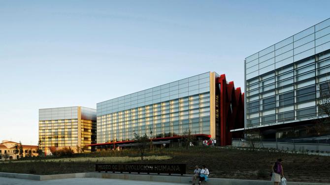 Así, el complejo se compone de tres volúmenes, el Museo de la Evolución Humana, el Centro Nacional de Investigación sobre la Evolución Humana y el Palacio de Exposiciones y Congresos. Estos dos últimos se separan del museo, que ocupa la posición central, por sendas hendiduras que dejan pasar la luz y que conectan la ribera con la zona urbana posterior, remitiendo, como se hará en el interior del museo, a las sensaciones espaciales que provoca la trinchera del ferrocarril de la Sierra de Atapuerca.