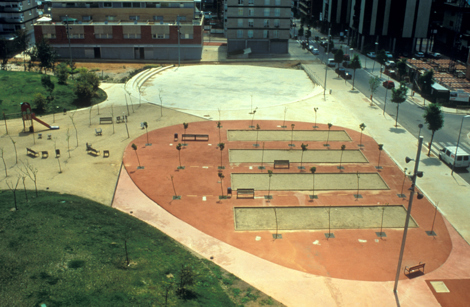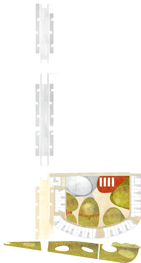 El edificio principal queda dividido en dos cuerpos: una base amplia y medio soterrada sobre la cual desliza un cuerpo más estrecho que contiene las viviendas. El tratamiento de las superficies aumenta esta intensidad. En la parte convexa, la base de acero galvanizado y vidrio sostiene una banda de ladrillo rojo con unas perforaciones ordenadas sistemáticamente. La parte cóncava expresa también la estandarización mediante unas enormes piezas de piedra de 3 x 1,50 metros. El trabajo con este plafón se propone desmaterializarlo y transformar la dureza del hormigón en un tejido, más adecuado para las zonas de día que valla.