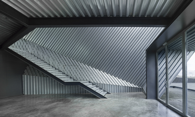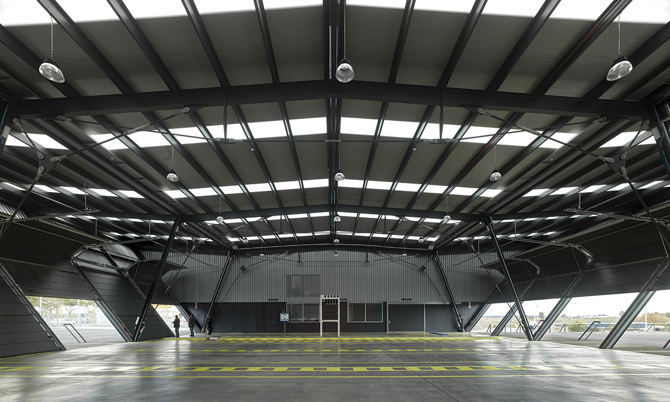 Para ello, se decidió emplear un sistema estructural de vigas y pilares atirantados y postesados, un esquema híbrido que rigidiza la estructura hasta no necesitar más elementos de arriostramiento que los pórticos principales del edificio. Pero también con un sistema constructivo directo y preciso de revestimientos metálicos de junta seca, materiales pertenecientes a la retórica industrial pero también al mundo del motor, buscando un diálogo natural con los verdaderos usuarios del edificio.