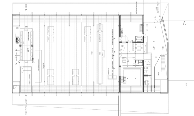 El programa solicitado era simple pero con condicionantes opuestos. Por un lado, un gran espacio diáfano horizontal y cenitalmente iluminado para la puesta a punto de los camiones. Por otro, una zona expositiva y comercial a varios niveles con necesidades de luz natural para las dependencias administrativas.