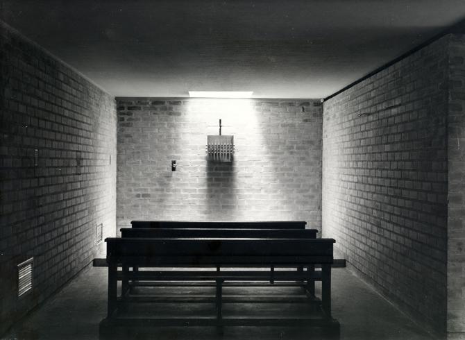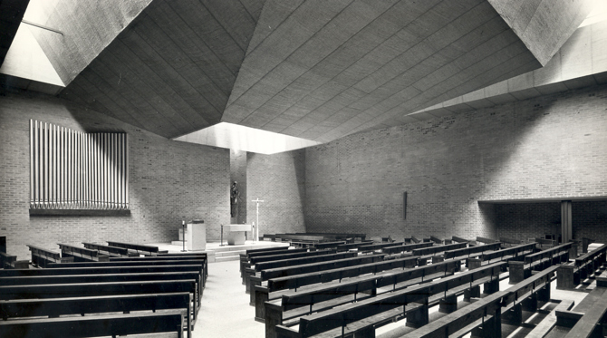 Es criterio fundamental para reforzar la impresión psicológica de la participación de la asamblea en la celebración, que esta se albergue en un único espacio sin que sea distinto ni se destaque el lugar destinado al presbiterio. Su posición bajo el mismo techo y limitado por los mismos muros, sin paramento primordial, dentro del cuadrado que es el ámbito de la asamblea, contribuye a que los fieles no sean meros espectadores pasivos. En la pared frontal se ha dispuesto el órgano como signo de esa participación colectiva que se verifica en el canto. Todo aquí resulta sencillo: cuatro paredes y un techo. Apenas nada se manifiesta al exterior, exceptuando el campanil de acero situado en el claustro, cuya gran cruz griega en lo alto convoca a los fieles. “Con nobleza, con sobriedad, con los menos elementos posibles, con la autenticidad de lo imprescindible, se procuró realizar una buena construcción. Obreros y técnicos colaboraron en la obra bien hecha”.