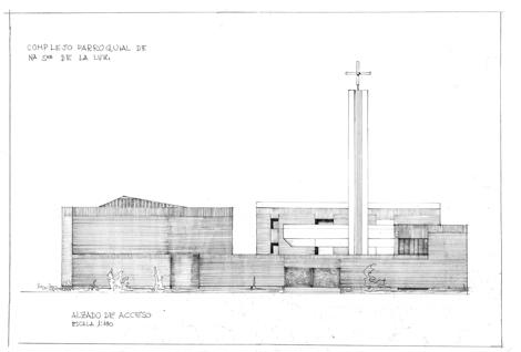 El proyecto había de plantearse exclusivamente como una ordenación y disposición de los espacios para las funciones a servir, gravitando sobre ellos mismos toda la expresión que hiciese explícita la forma de vivirlos. La arquitectura contribuiría a la significación de cada uno de los ambientes en el complejo del edificio. En el proyecto, esta diversidad de funciones se congrega alrededor de un patio, por el que tienen acceso a través de un pórtico con una sola comunicación con el exterior. Esta disposición hace que en él confluyen todas las circulaciones y, por consecuencia, sea lugar de encuentro para todos los que acuden a sus servicios. Este es el sentido que se ha dado al único acceso desde el exterior y la distribución en torno al patio, como atrio ceñido y circunscrito por la nave del templo para la asamblea y celebración del culto, dependencias y despachos parroquiales, club, sala de juegos infantiles, sala de actos, y locales de asistencias y pastoral.