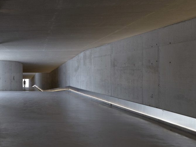 El espacio más social y compartido, el pabellón de usos múltiples, se encuentra bajo una única losa de hormigón con cubierta ajardinada en continuidad con el terreno, diluyendo así los límites entre lo natural y lo construido, en un juego proyectual a medio camino entre lo tectónico y estereotómico. Esta cubierta no solo integra el edificio en el entorno y minimiza su altura sobre la rasante natural, sino que también permite optimizar el consumo energético. Con esa misma intención de promover la sostenibilidad, los tres volúmenes de las viviendas son bastante compactos, con fachadas acristaladas hacia el sur para beneficiarse de la radiación solar y la luz natural, mientras que las fachadas orientas al norte son prácticamente ciegas.