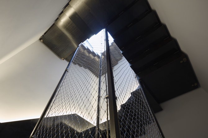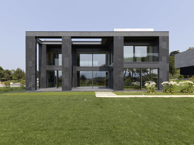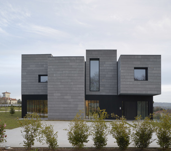 La planta sótano que conecta bajo tierra todo el complejo funciona como un basamento del que emergen los volúmenes de las tres viviendas, bastante sencillas en su composición, sin estridencias, buscando una imagen atemporal. La decisión de utilizar el mismo material para su envolvente, una fachada ventilada de piedra natural pero en diferentes tonalidades –del negro al blanco, pasando por el gris– dota de unidad al conjunto edificado, otorgando al mismo tiempo cierta individualidad a cada vivienda.