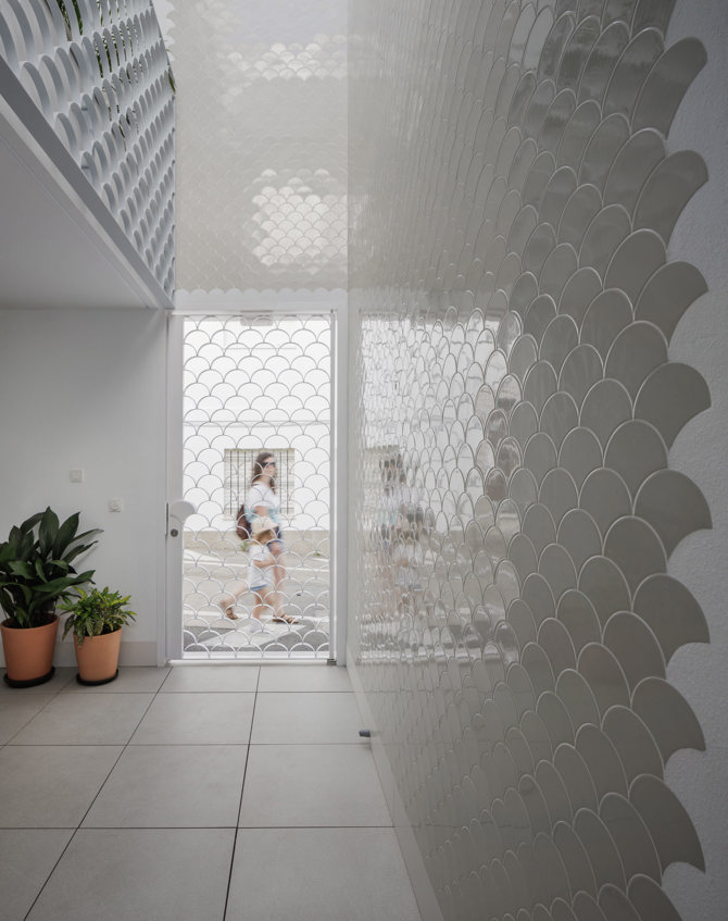 Las diversas calidades materiales y constructivas, comprometidas con lo artesanal y local, proporcionan un mundo de matices en texturas, brillos y tonos. Las infinitas posibilidades del color blanco funden la arquitectura con la poderosa luz del atlántico gaditano.