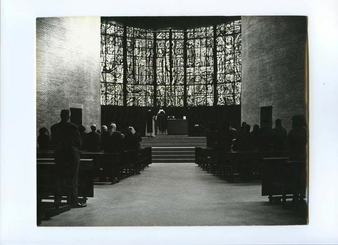 Resulta así un espacio sobrio y silencioso, pero convergente y dramático a la vez, acentuado por el tratamiento de la luz y el color y dominado por el gran crucifijo del escultor Pablo Serrano, suspendido sobre el altar con cables en el aire. El conjunto está declarado BIC.
