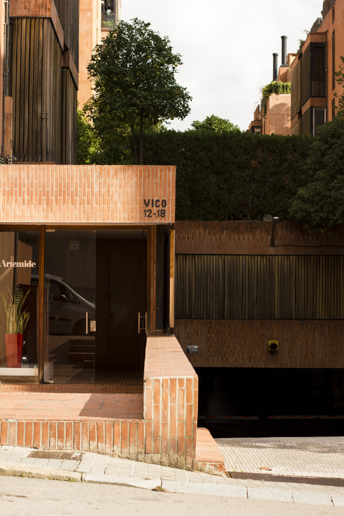 La fachada la forman muros de revestimiento cerámico y aberturas exteriores, cuidadosamente protegidas mediante un cerramiento de lamas verticales de madera.