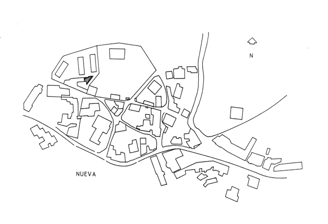 El consultorio médico forma parte de un conjunto de equipamientos públicos, todos ellos de pequeño tamaño, situados en el pueblo de Nueva. Construidos en distintas fases, además del consultorio, la instalación incluye una casa de cultura y un centro social. Se disponía para organizar este complejo de un solar irregular, lugar de encuentro de un trazado rural (de edificaciones tradicionales) con nuevos bloques de viviendas en hilera de promoción pública.