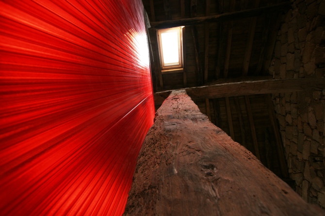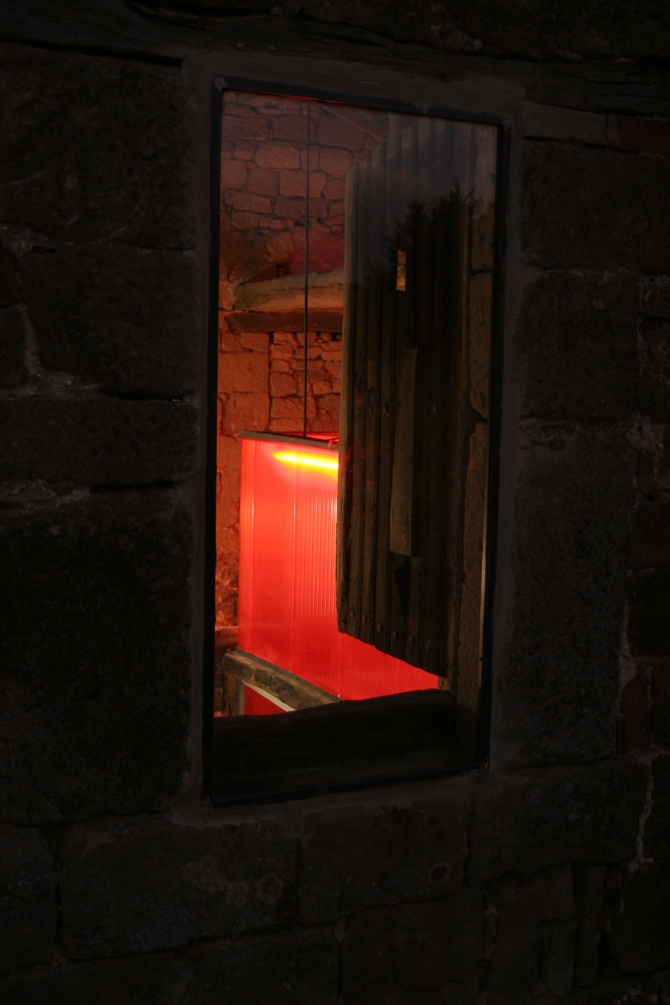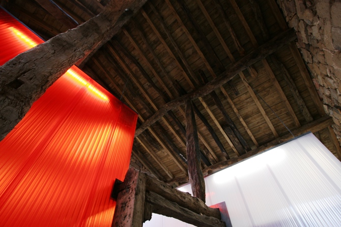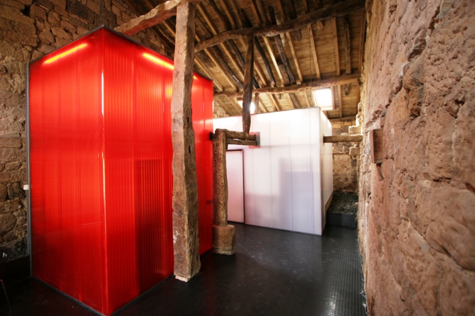 La propuesta se formaliza en dos piezas de policarbonato de diferentes colores (utilizando los colores corporativos de la sanidad regional) que se sitúan en el espacio vacío sin tocar los muros existentes y resuelven el programa funcional propuesto. Todos los materiales de la intervención, paramentos verticales y solados se resulten con materiales que nos sitúan cronológicamente y se diferencian de la arquitectura tradicional de la zona de piedra de mampostería y vigas de roble (paramentos de chapa galvanizada revistiendo los tabiques donde se sitúan las instalaciones, policarbonato y suelos de goma).