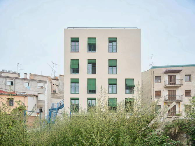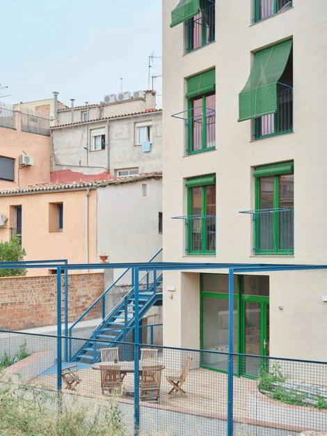 El grupo impulsor busca equilibrar la vida comunitaria y privada. Se trabaja la comunidad cómo un potencial y se concibe el edificio como una "casa grande" y transitando hacia lo privado con filtros y diversos niveles de intimidad. El programa de vivienda se complementa con espacios comunitarios distribuidos estratégicamente, compensando su tamaño reducido. La planta baja establece la relación con el barrio con una sala polivalente y un local gestionado por la cooperativa. En la primera planta se encuentra el espacio comunitario principal la cocina-comedor con capacidad para 40 personas y terraza exterior, y en la quinta planta hay un jardín de invierno (invernadero) que da acceso a una gran terraza con vistas a Montserrat.