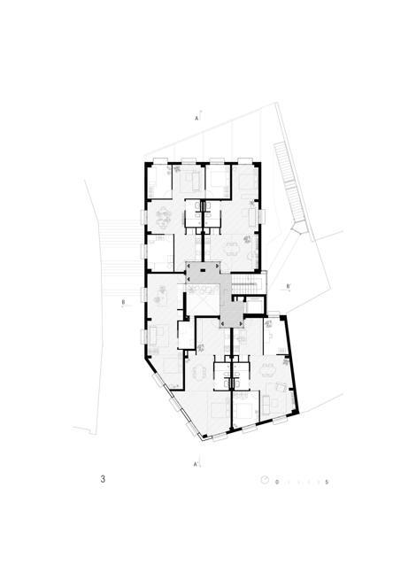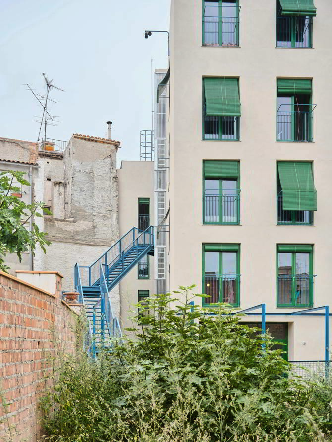 El edificio se organiza alrededor de un pequeño patio central alrededor del que se organizan las circulaciones y es el núcleo de la vida comunitaria. Desde el acceso se observa cómo el patio conecta con la planta baja y asciende acompañado de una escalera abierta y generosas circulaciones hasta la cubierta. Se construye una escalera exterior de evacuación que permite dobles circulaciones y permite la escalera interior abierta, que iluminando lateralmente el patio en toda su altura.
