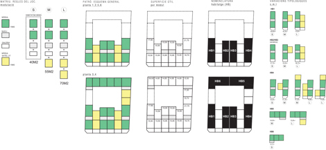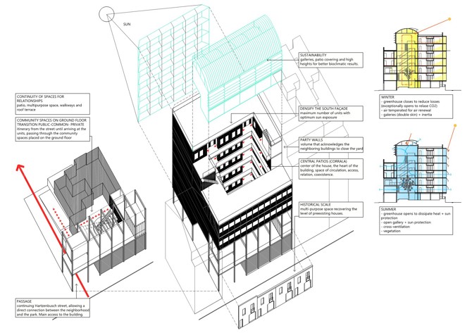 - Redefinir el programa de la vivienda colectiva. El programa plantea 28 viviendas (40, 60 y 75 m2) y espacios comunitarios que extienden el habitar desde el espacio privado al espacio público potenciando la vida comunitaria. Cocina-comedor, lavandería, espacio polivalente, espacio para invitados, espacio de salud y cuidados, almacenaje, y espacios exteriores o semiexteriores como las azoteas. Todos ellos articulados alrededor de un patio central, un gran espacio de relación.