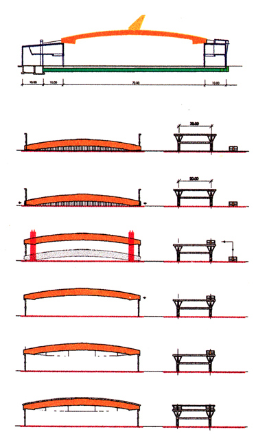 El material y la sección transversal de estas vigas vinieron muy condicionados por el diseño arquitectónico que imponía como material el hormigón y una sección transversal formada por tres almas delgadas paralelas unidas por diafragmas. Estas vigas quedan vistas por el interior de los pabellones aunque no en toda su altura ya que las jácenas y correas de cubierta entestan a media altura de las almas laterales produciendo una sensación de mayor ligereza del Conjunto de la cubierta.