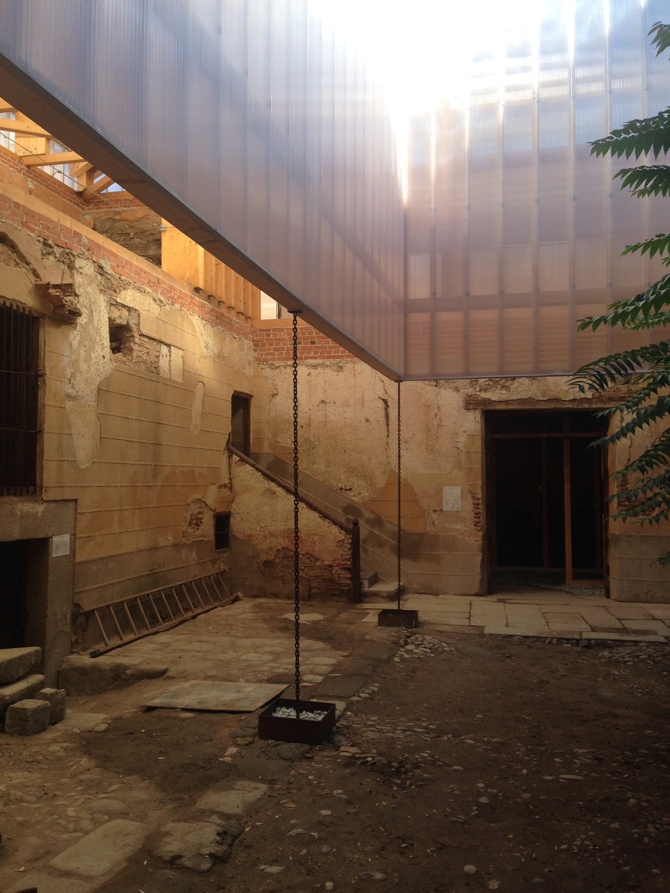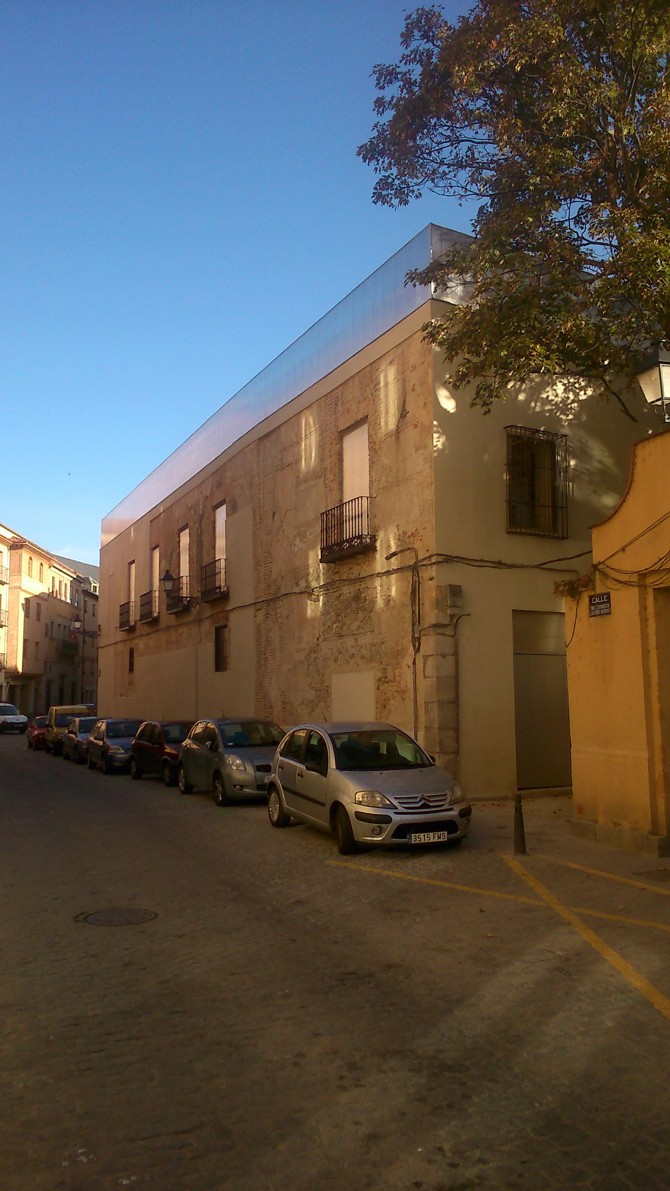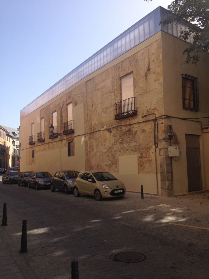 La intervención en un edificio histórico en ruinas puede desarrollarse a través de la simbiosis entre el edificio a restaurar y el edifico a ejecutar. Es el caso de la no restauración, de la no rehabilitación, el nuevo edificio se desliza entre las paredes arruinadas del edificio original, entiende su tipología, pero mantiene sus propias determinaciones compositivas y de uso; la nueva construcción se mueve entre los viejos lienzos, que son totalmente necesarios para dar sentido a la propuesta.
