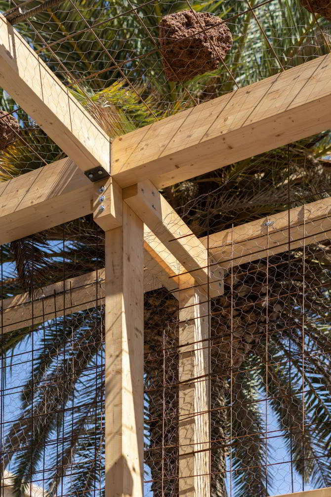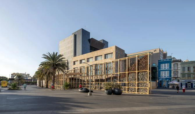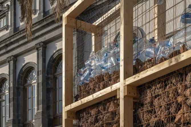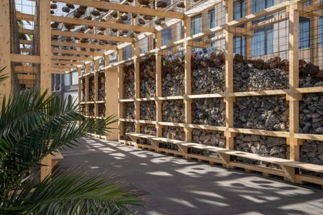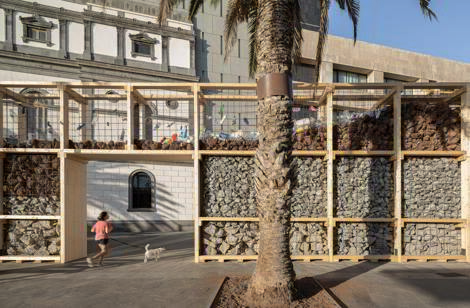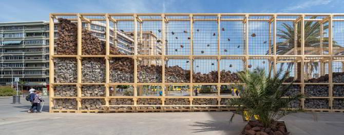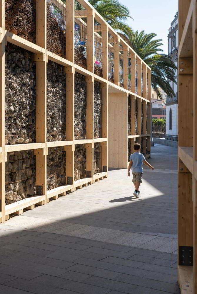 Los dos muros de gaviones funcionan como un nuevo equipamiento urbano, ofreciendo una puerta de entrada al Teatro Pérez Galdós y a la plaza, generando aperturas visuales hacia las actividades al otro lado y proporcionando espacios de pausa, descanso y encuentro. Ambos muros se conectan mediante una celosía de madera y piedra construida con la misma lógica estructural, que conforma un espacio de cobijo para sentarse, conversar, celebrar reuniones, charlas o talleres, protegido del sol y del ruido procedente de la Terminal de Guaguas del Teatro. De esta forma, el pabellón actúa como un búfer acústico para la plaza de Stagno, activando y haciendo más agradable la vida al aire libre entre el teatro y la parada de autobuses cercana.