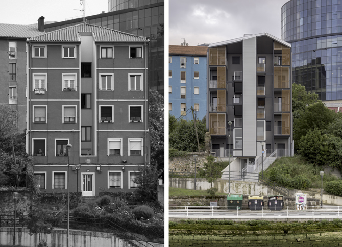 La exigente y difícil intervención de transformación llevada a cabo en un emplazamiento con habitantes, nos ofrece la oportunidad de demostrar la pertinencia de las estrategias y políticas de ayuda y fomento de la rehabilitación para la adecuación del parque edificatorio existente a las necesidades actuales. El edificio fue finalista de los premios trienales del Colegio Oficial de Arquitectos Vasco Navarro.