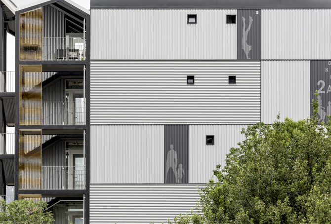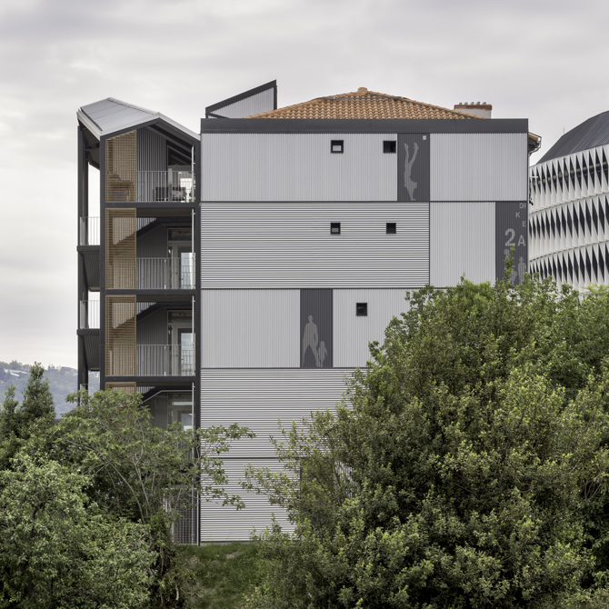 La intervención de rehabilitación se completa mediante una actuación en la envolvente de la edificación mediante sistemas de aislamiento exterior, que permite mejorar sensiblemente su eficiencia energética, mejorando su comportamiento higrotérmico, y solucionando patologías relacionadas con la edad de la edificación y la ausencia de intervenciones de rehabilitación adecuadas. Las fachadas laterales se revisten mediante una piel de chapa de aluminio minionda con juntas verticales y horizontales que se alternan y contribuyen a crear una composición sutil que, a modo de contenedores marítimos apilados, nos retrotrae al pasado industrial de la ría de Bilbao. Estas nuevas pieles se relacionan compositivamente con la nueva fachada principal. La intervención, y en especial la nueva edificación, no se percibe como un elemento servidor, sino que articula compositivamente una nueva fachada a la ría, integrándola en el frente fluvial de forma respetuosa con las características imperantes en el área de Olabeaga.