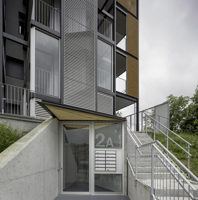 La comunicación del nuevo núcleo de comunicación vertical y las viviendas existentes se articula mediante unas pasarelas resueltas de manera análoga a la crujía exterior, que se introducen en el interior de la edificación existente.