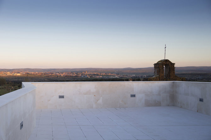 Un espacio para trabajar como base sólida construido con hormigón in situ, tintado y texturizado y sobre esto un espacio doméstico, separado pero apoyado, distante y deslizado. El espacio domestico se cubre con una topografía ligera de caliza.