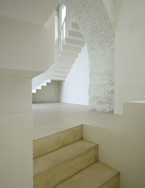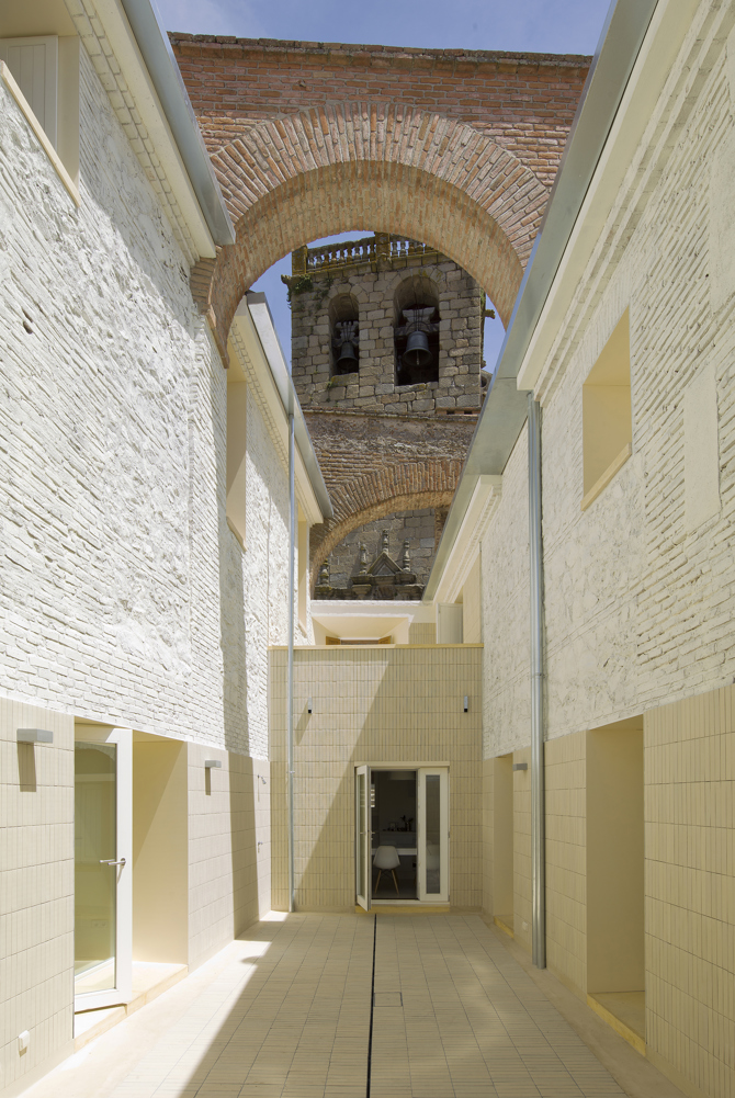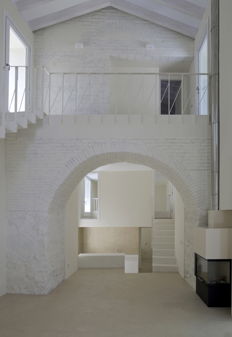 El proyecto abre un patio grieta en su interior, largo y estrecho, que ordena a ambos lados las dos viviendas desiguales para dos hermanos. Las cubiertas se desmontaron y rehicieron un metro más altas reusando las tejas. Las dos naves quedan engarzadas entre sí con los dos poderosos muros de arcos de ladrillo protegidos patrimonialmente.