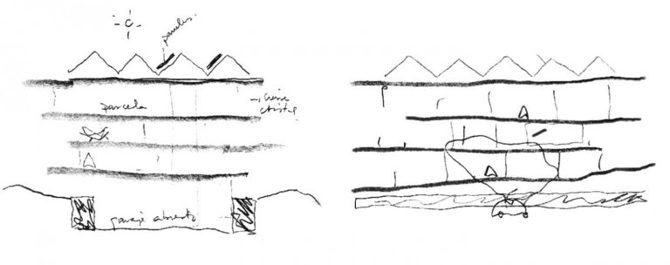 Era la peor crisis conocida. Nadie iba a construir nunca más. Nos relajamos y propusimos solares en altura. Cualquier cosa que nos pidiera el cliente se estudiaba. Más grande, más pequeño, más vuelo, más terraza, más habitaciones, ninguna. El baño fuera, el baño dentro, con armarios o sin ellos. Solo una serie de condiciones: pilares con luz de seis metros para que los coches se muevan con alegría, que el sótano respire y el jardín entre y si hay un incendio no pase nada, que la escalera sea ventilada sin gastar en carpinterías (nadie sube por ella casi nunca), que el ascensor admita a un ciclista, que el suelo fuera radiante-refrescante, que lo paneles se apoyen sobre muchas cubiertas inclinadas como en una mezquita, que el suelo sea igual en todas partes, que las puertas vayan de suelo a techo, que las carpinterías sean muy grandes para que el propietario no las tire cuando las mueva. Que los aleros sean grandes para proteger del sol y del vértigo. Que nadie se vea como en un acantilado. Resultado: nada es igual a nada pero no se detecta.