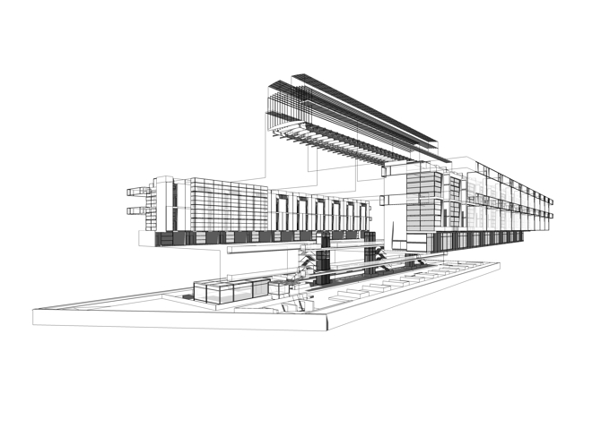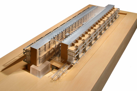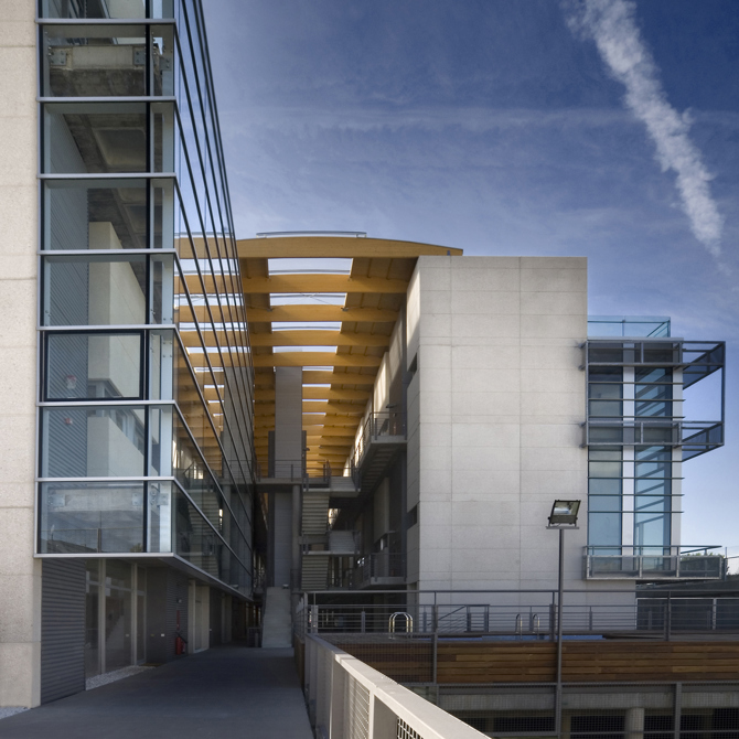 Dicho espacio alberga tres núcleos verticales de comunicación que conectan con pasarelas en los niveles de acceso, y a la vez da luz a todas las unidades a través de la cubierta resuelta con correas de madera, que descansan sobre cerchas de madera laminada. El decalaje en planta de las dos alas que conforman el espacio central acorta visualmente la longitud del conjunto y le da transparencia. Interiormente se desarrollaron tres tipologías distintas según niveles. Constructivamente la obra es austera a base de elementos prefabricados de hormigón, madera laminada, acero galvanizado en perfiles y láminas deployé.