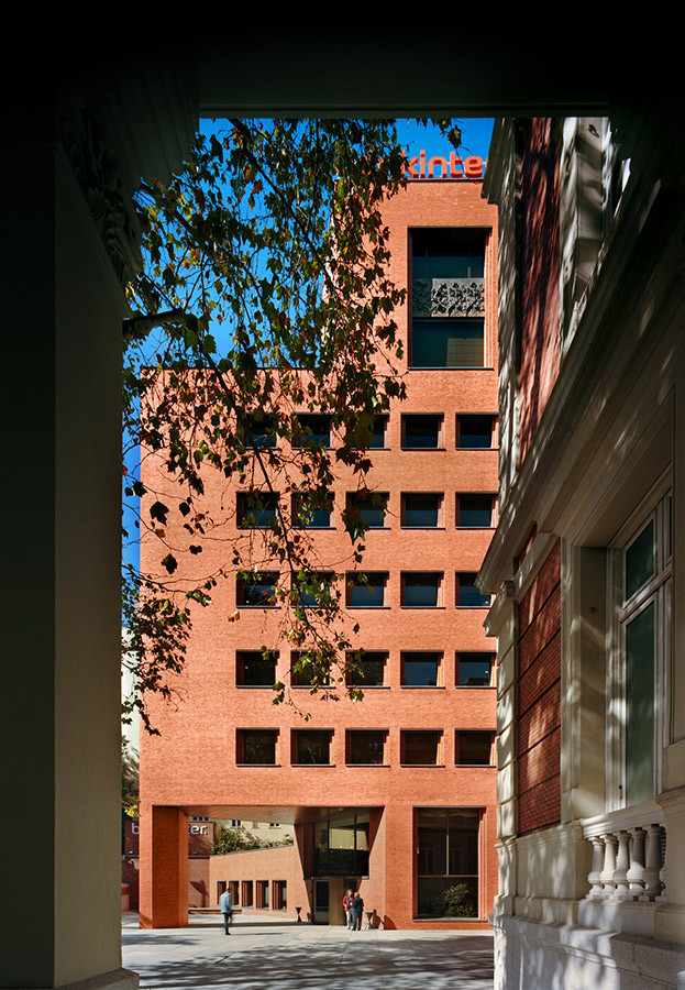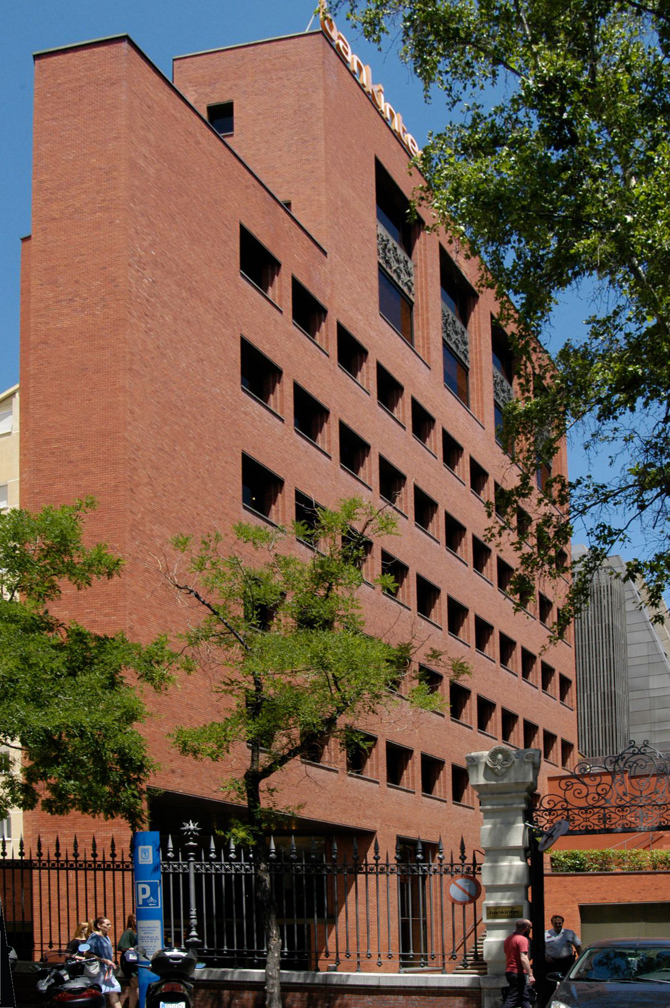 El nuevo edificio convive con el existente al mismo tiempo que mantiene su autonomía. El cambio del acceso –que se produce ahora desde la calle Marqués de Riscal y no desde la Castellana– provoca que los edificios mantengan su independencia y que la afilada esquina/proa –a que da lugar la diagonal que impone la servidumbre a las ventanas del edificio colindante– exagere la altura del edificio. Pero tal independencia no es óbice para que el nuevo edificio pague tributo de respeto al palacete existente ya que para su construcción se utiliza un ladrillo prensado similar. Bankinter hace uso de una geometría en la que las directrices oblicuas prevalecen y en la que la atención a todo lo contingente –circulación, ordenanzas– contribuye definitivamente a establecer el rotundo volumen.