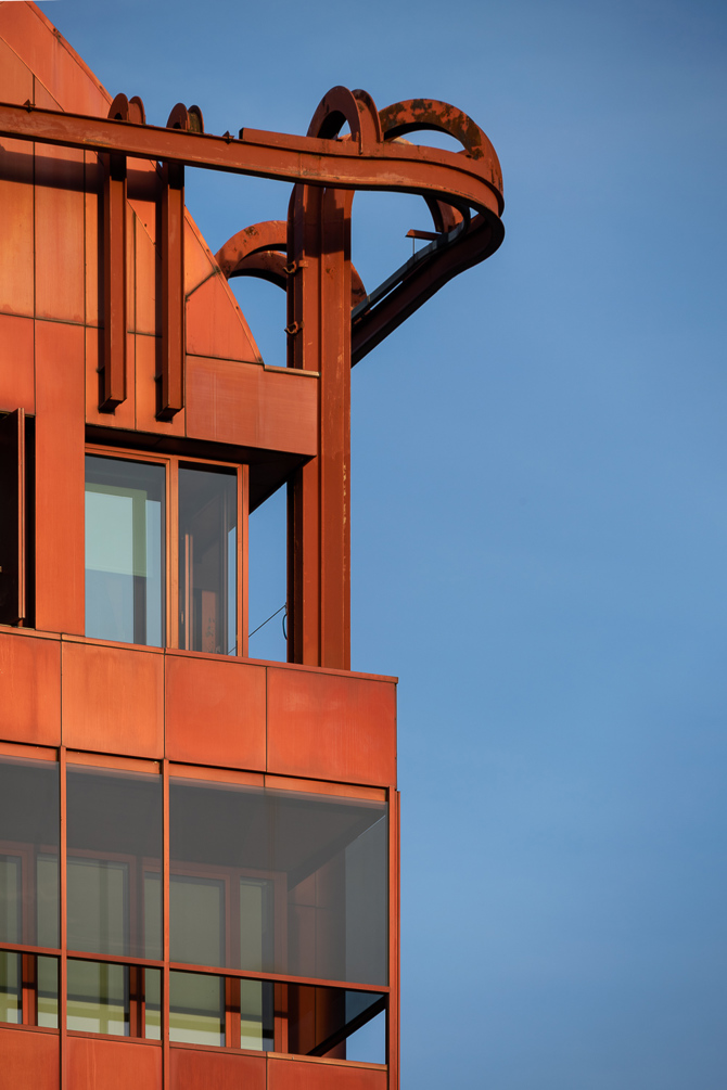 - En alzados norte y sur, las carpinterías, los conductos, los antepechos, la bóveda superior y los rótulos laterales se han realizado con aluminio anodizado rojo claro.
