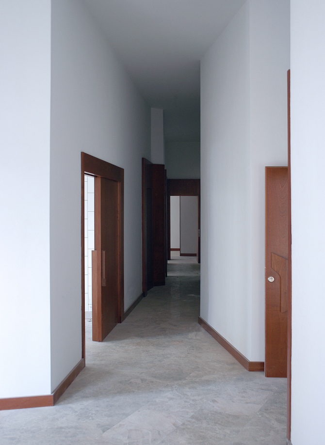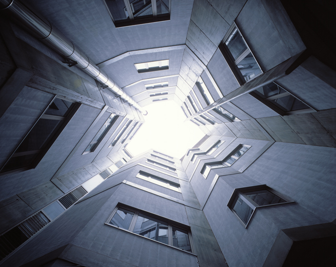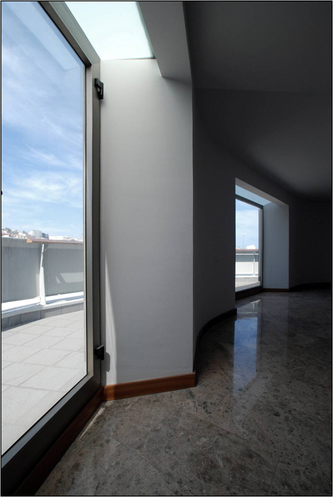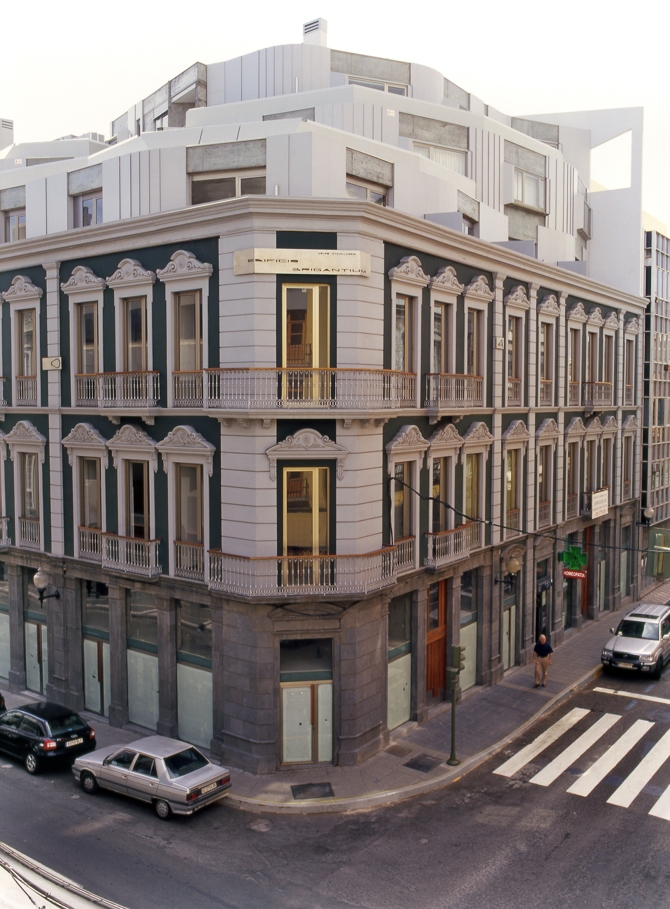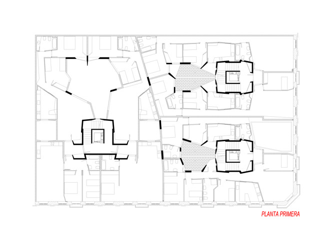 Cada vivienda se ajusta a su propietario como un traje a medida. Nunca existe un estado “perfecto” de las plantas. Un sistema inestable en continuo proceso de cambio que se equilibra, colapsa y vuelve a requilibrarse. En este escenario en movimiento, las tres cajas de escaleras apantalladas son “elementos de resistencia” que, por su carácter monolítico, ponen en valor la variedad de tipos edificatorios. Los patios son sus negativos. En ellos se leen las ondas que emiten las plantas. En la medianera un hueco trapezoidal enmarca la visión de la Catedral de Las Palmas.