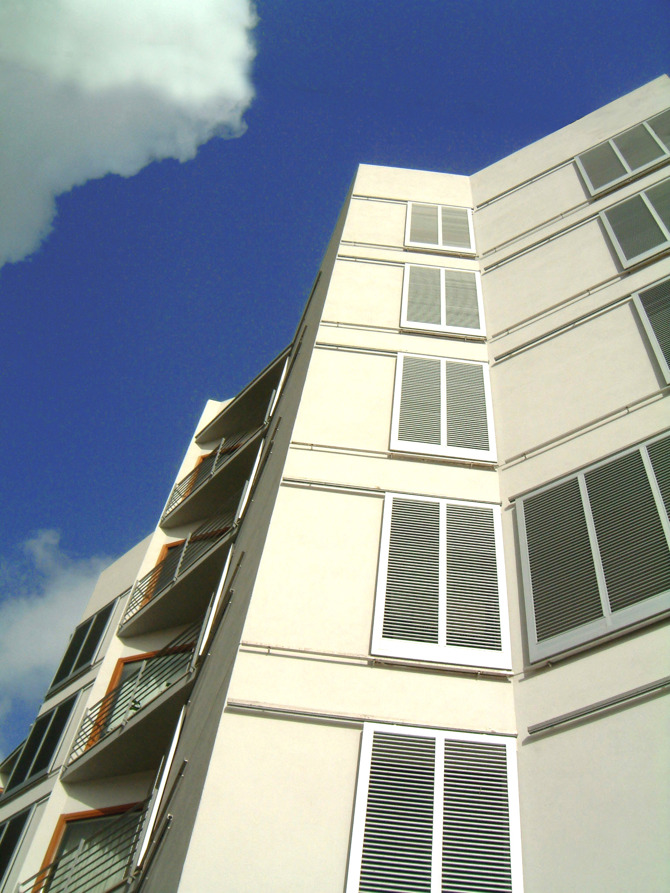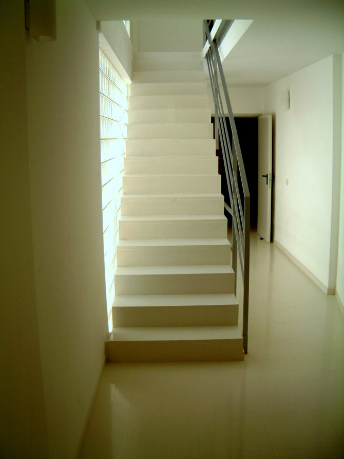 Al ser un solar alargado y de poca profundidad se unifican las fachadas de las dos calles mediante un pliegue continuo, como si de una única fachada se tratase. Este pliegue responde a la distribución de las piezas principales de las viviendas. El núcleo de escalera se adosa en la parte central de la medianera articulando el despliegue de las tres viviendas.