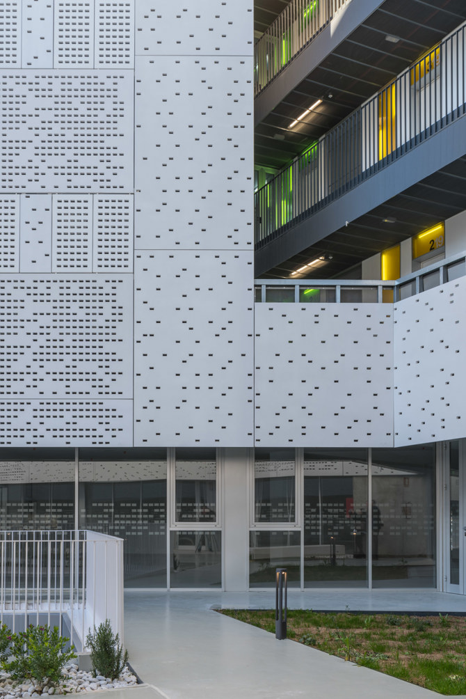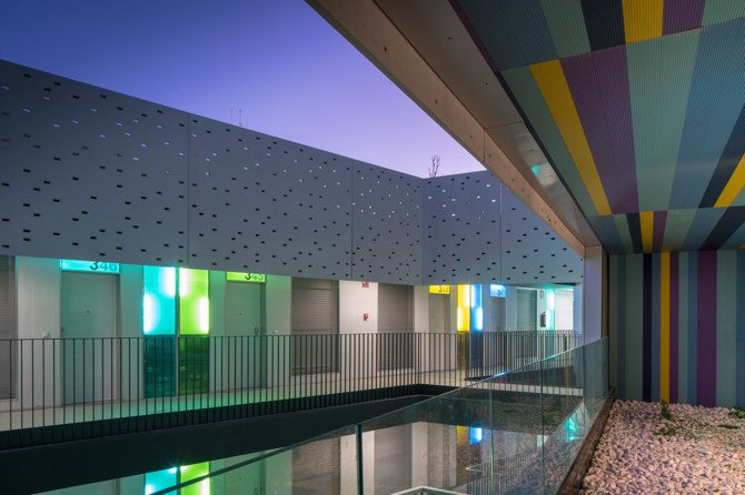 Una grieta permite mostrar la topografía y actividad de la guardería. La piel exterior se rompe cuando se abren las contraventanas de hormigón prefabricado de 3cm, dando lugar a infinitas composiciones de fachada. Por la noche es una gran luciérnaga pixelada.