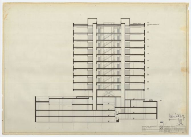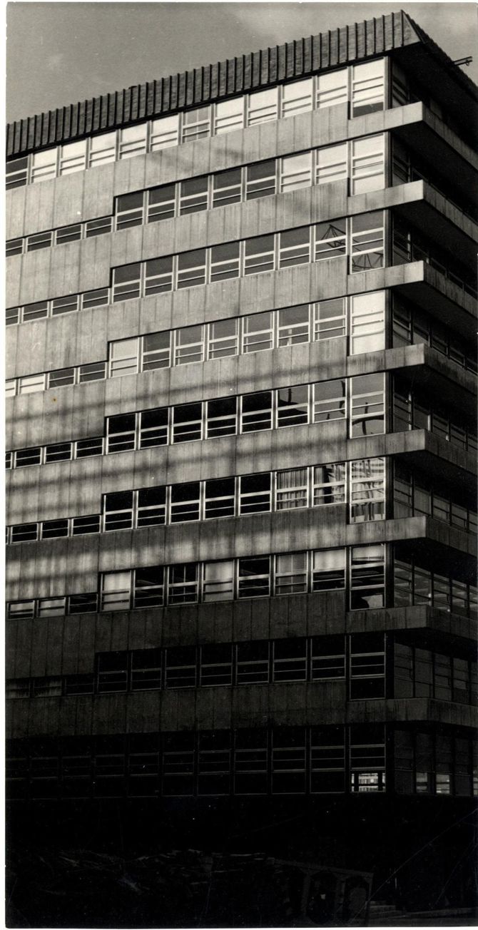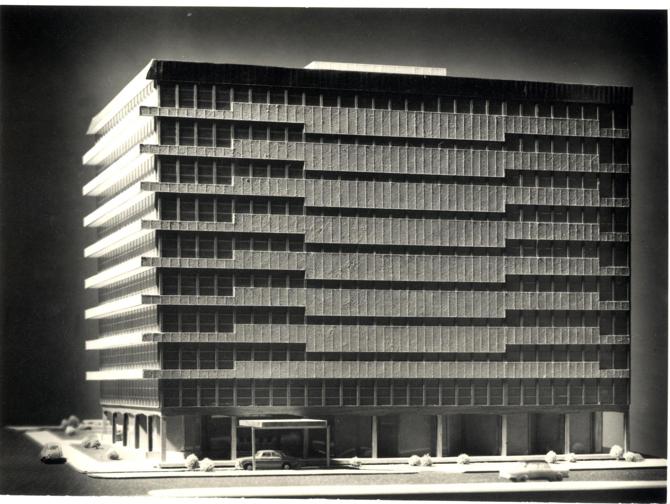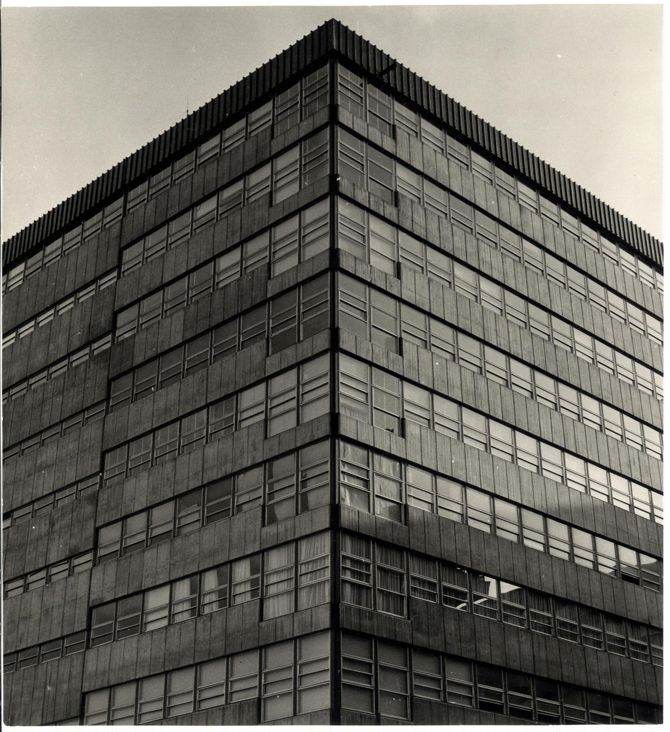 Hemos creído conveniente acentuar la masa del edificio con un tratamiento plano de superficies, proyectando un volumen general sencillo, macizo y rectilíneo. En contraste con este volumen general simple, introducimos en la planta baja una mayor libertad de composición justificada por su función; y aprovechando la existencia de la zona ajardinada dentro del solar, correspondiente al techo de las plantas subterráneas, creamos unas penetraciones del jardín en el edificio que rompen la rigidez de la composición a la altura de la vista del paseante.