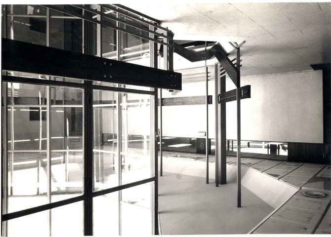 La cuadrícula de 0,815 m ancho-alto correspondiente a medio módulo que, como decimos, se refleja en la fachada, corresponde también a la prevista para el diseño de las mamparas de división interior, para obtener una igualdad de dimensiones que relacionen el exterior y el interior del edificio. Esta relación se acusa en el falso techo de escayola perforada, que se incorpora en cierto modo a la fachada, al ganar la altura del dintel de las ventanas, elevándose en su proximidad desde su cota general más baja.