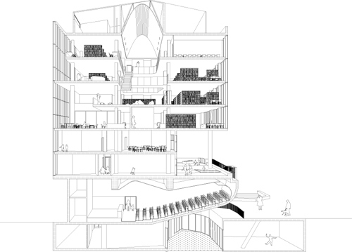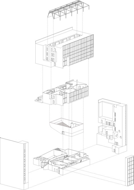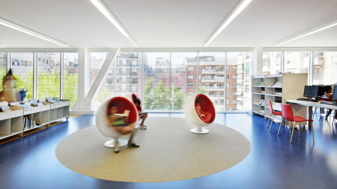 Un edificio de equipamientos que agrupa distintos usos: una guardería, una biblioteca, una ludoteca, un centro cívico y un salón de actos. Cinco programas que piden una relación estrecha con el exterior pero comparten una sola planta baja. Esta se convierte en un lugar cívico permeable y activo, que conecta la ciudad circundante con el edificio y el parque en el interior de la manzana. El resultado es un collage de diferentes partes, un paseo secuencial de episodios urbanos.