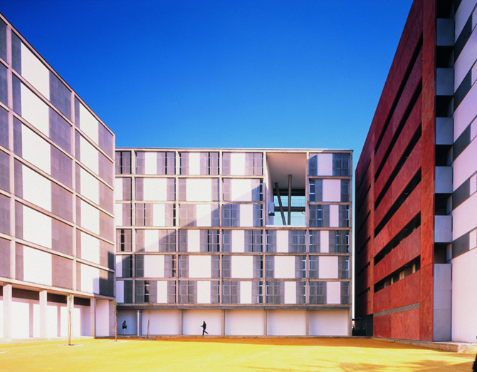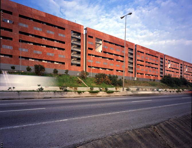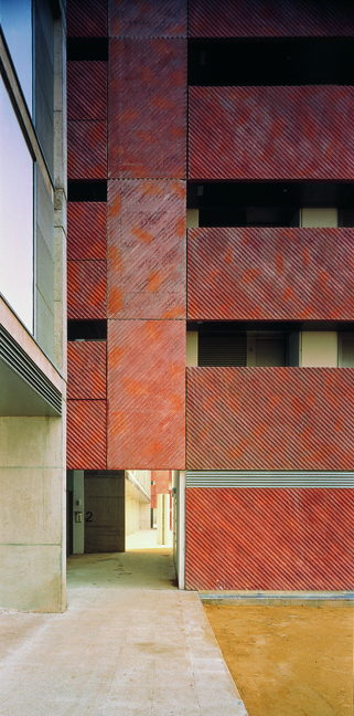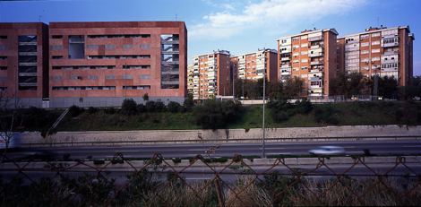 El nuevo edificio se concibe como una serie de pantallas ante la autopista, un patrón repetitivo que con pequeñas pero continuas variaciones combinatorias percibiremos solo a gran velocidad. Cinco grandes diedros, verdaderas pantallas acústicas protegen las viviendas de la vía de tráfico y se abren hacia el interior del solar en una cadena de jardines comunitarios.