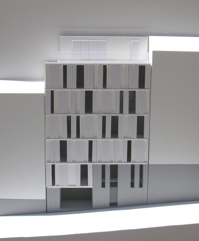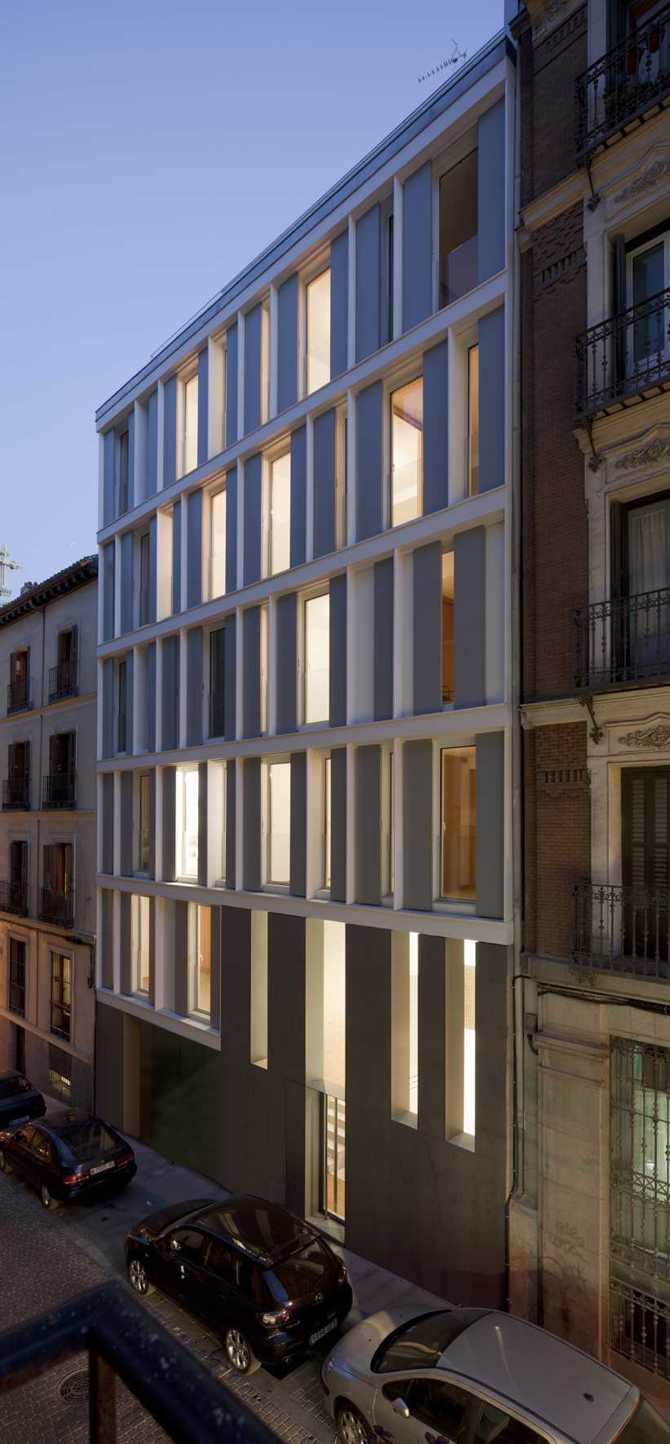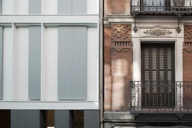 El proyecto ha tratado de armar una arquitectura contemporánea, en este caso bien acogida por la Comisión Local de Patrimonio Histórico por su pulcra implantación en el Barrio de Las Letras, con una promoción de viviendas libres y rentables.