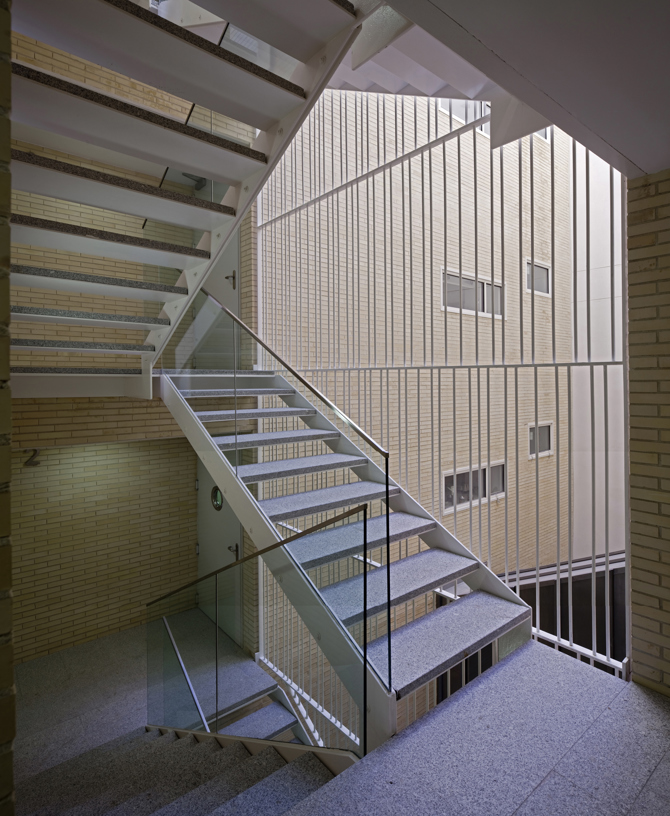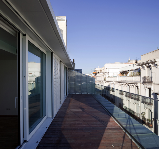 La solución descrita de circulación vertical y accesos de plantas rinde un modesto tributo a la denostada y casi desaparecida corrala madrileña.
