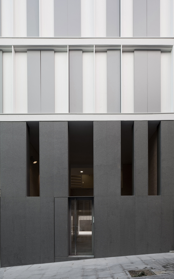 El tramo de escalera independiente, de portal a primera planta, que dota de cierta singularidad a la única vivienda de tres dormitorios, algo tiene que ver con las escaleras palaciegas que en algunos edificios conducían al principal, marcando diferencias muy de la época. El alzado exterior sale de las fachadas de la calle, huecos de marcada proporción vertical en permanente movimiento por un sistema de contraventanas correderas, en tablero fenólico de color gris, paneles de aluminio blanco mate revistiendo macizos y un inevitable guiño a la estupenda fábrica de granito que forma el zócalo del número treinta y cuatro.