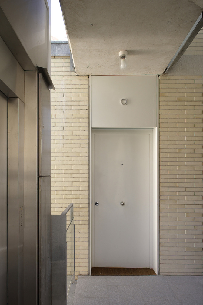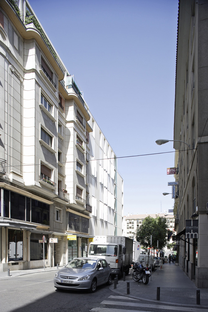 Ante el agotamiento de la superficie disponible la última planta se resuelve con una planta de ático retranqueado, pero manteniendo el plano de fachada en toda la vertical y de esta manera enlazar perfectamente ambos edificio