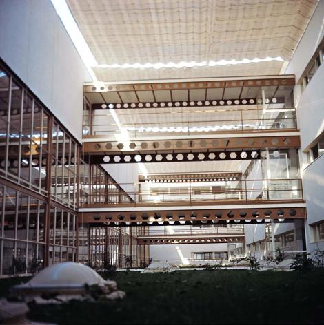Por desconocidos, no existió posible acuerdo con los edificios circundantes que se realizarían con posterioridad. Se cierra sobre sí mismo, sobre un patio central ajardinado cubierto con toldos desde primavera hasta otoño, al modo de las calles y patios andaluces, y da sus espaldas cerradas al dudoso porvenir exterior del conjunto.