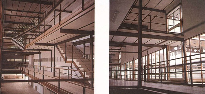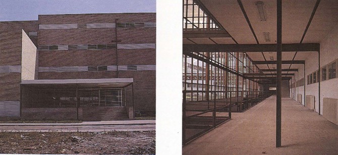 Su aproximación crea tensiones interiores que acusa la composición general. Por densidad de uso se sitúan las aulas importantes en planta baja y las que no caben se amontonan en curiosas torres en los extremos.