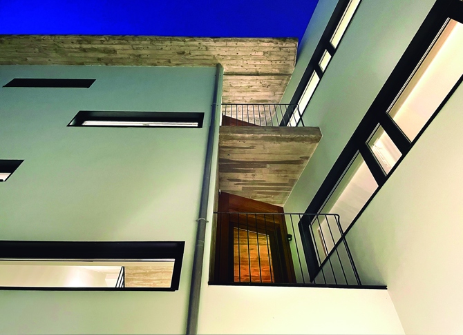 El edificio, en su fachada posterior, se descompone en dos volúmenes que se entrelazan a su vez mediante una terraza en la unión de los mismos. Se utiliza el mismo material y color entendiendo todo como un conjunto único. La elección del color azul verdoso de las fachadas pretende inundar de luz un patio urbano situado entre edificaciones residenciales de gran altura que impiden el aprovechamiento del sol, de ahí el intento de evocar el color del cielo. La parte inferior de la fachada posterior está formada por muros de hormigón armado visto, material que se utilizará en la escalera y en paramentos y techos de las viviendas.