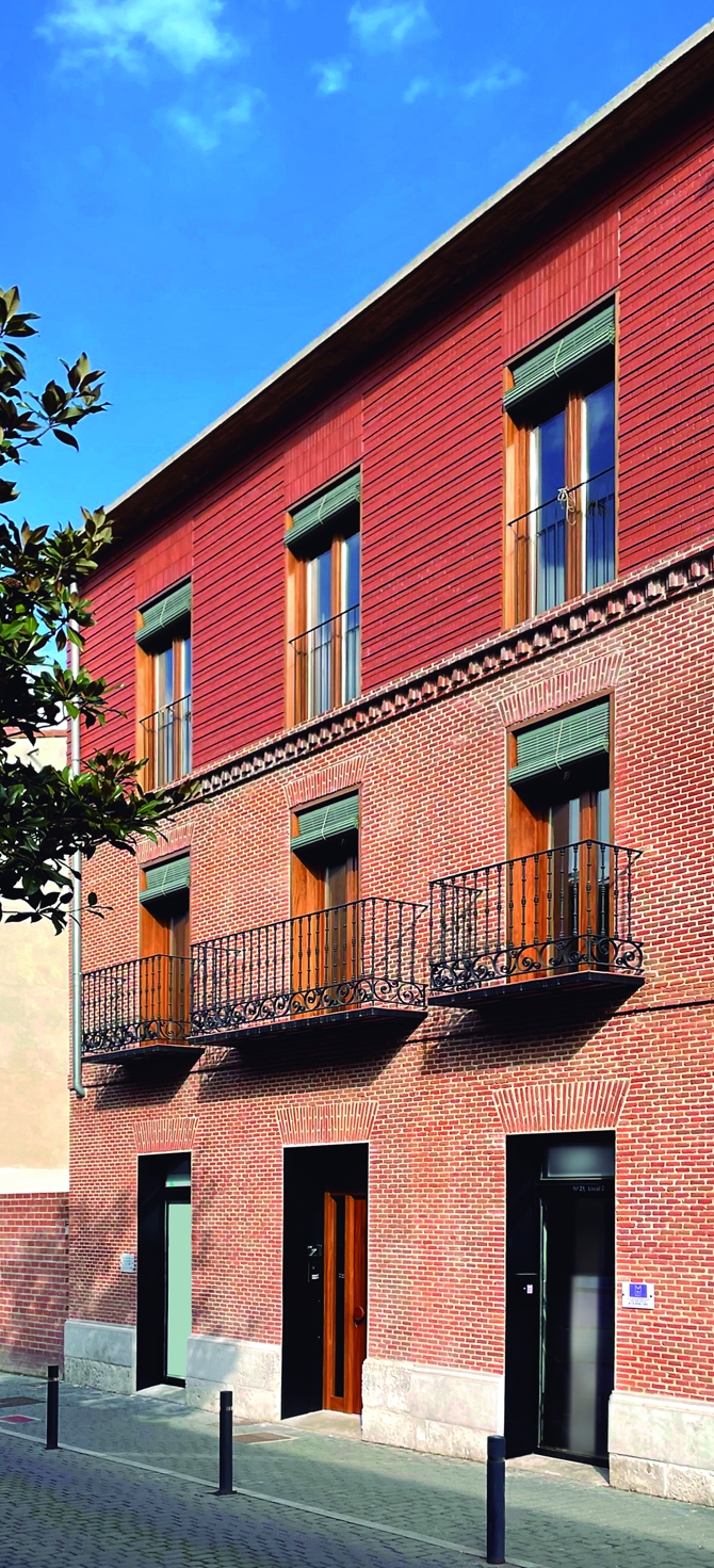Se ha utilizado ladrillo macizo colocado a tizón y a hueso, característico de la zona en la que se ubica el edificio. El ladrillo se incorpora en el interior del portal, creando una transición al interior de las viviendas, esta vez colocado a panderete y junta corrida. Se proyectan recercados de acero en la planta baja de fachada principal y recercados de madera maciza de iroko en las plantas siguientes, procurando regularizar los huecos de la fachada existente. Estos materiales se trasladan a las fachadas a patio, tanto en carpinterías como en los recercados, creando una relación entre ambos alzados.
